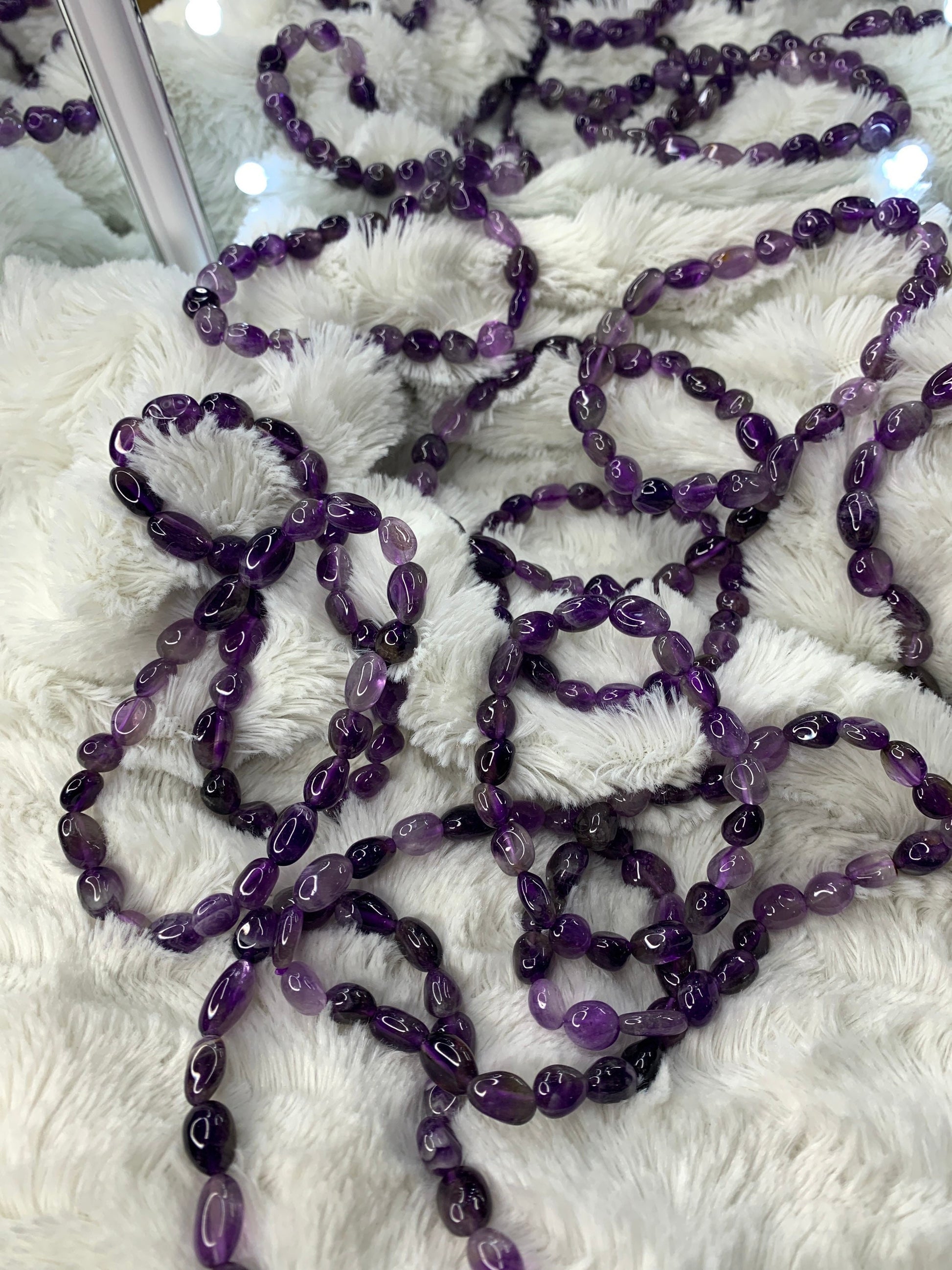 Amethyst Pebble Bracelet. BRC-0021 Amethyst is a powerful and protective stone. It guards against psychic attack, transmuting the energy into love and protecting the wearer from all types of harm, including geopathic or electromagnetic stress and ill wishes from others. Amethyst is a natural tranquiliser, it relieves stress and strain, soothes irritability, balances mood swings, dispels anger, rage, fear and anxiety. Alleviates sadness and grief, and dissolves negativity. Amethyst activates spiritual awareness, opens intuition and enhances psychic abilities. It has strong healing and cleansing powers. Amethyst encourages sobriety, having a sobering effect on overindulgence of alcohol, drugs or other addictions. It calms and stimulates the mind, helping you become more focused, enhancing memory and improving motivation. Amethyst assists in remembering and understanding dreams. It relieves insomnia. Encourages selflessness and spiritual wisdom. You will receive one bracelet similar to that pictured in this listing. Handmade with natural stones. Balance your life with this beautiful healing crystal bracelet. Great gift for yourself and others. See more at stonepathtrading.com