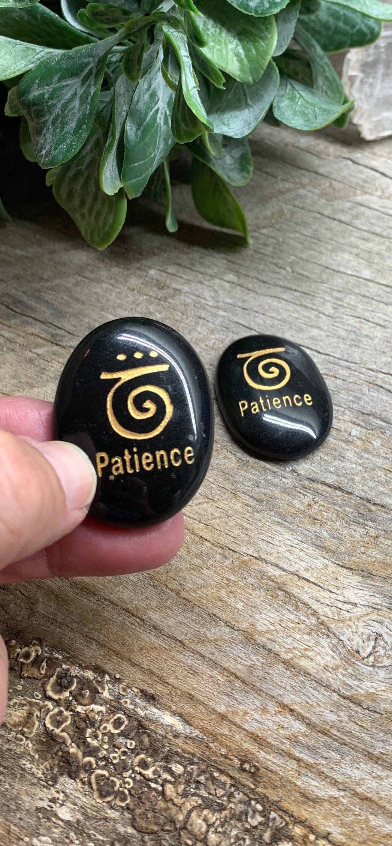 Patience. Black Obsidian Carved Word Affirmation (Approx. 1 1/2") FIG-0317 Very powerful and creative stone. Increases self control. Grounding. See more at stonepathtrading.com