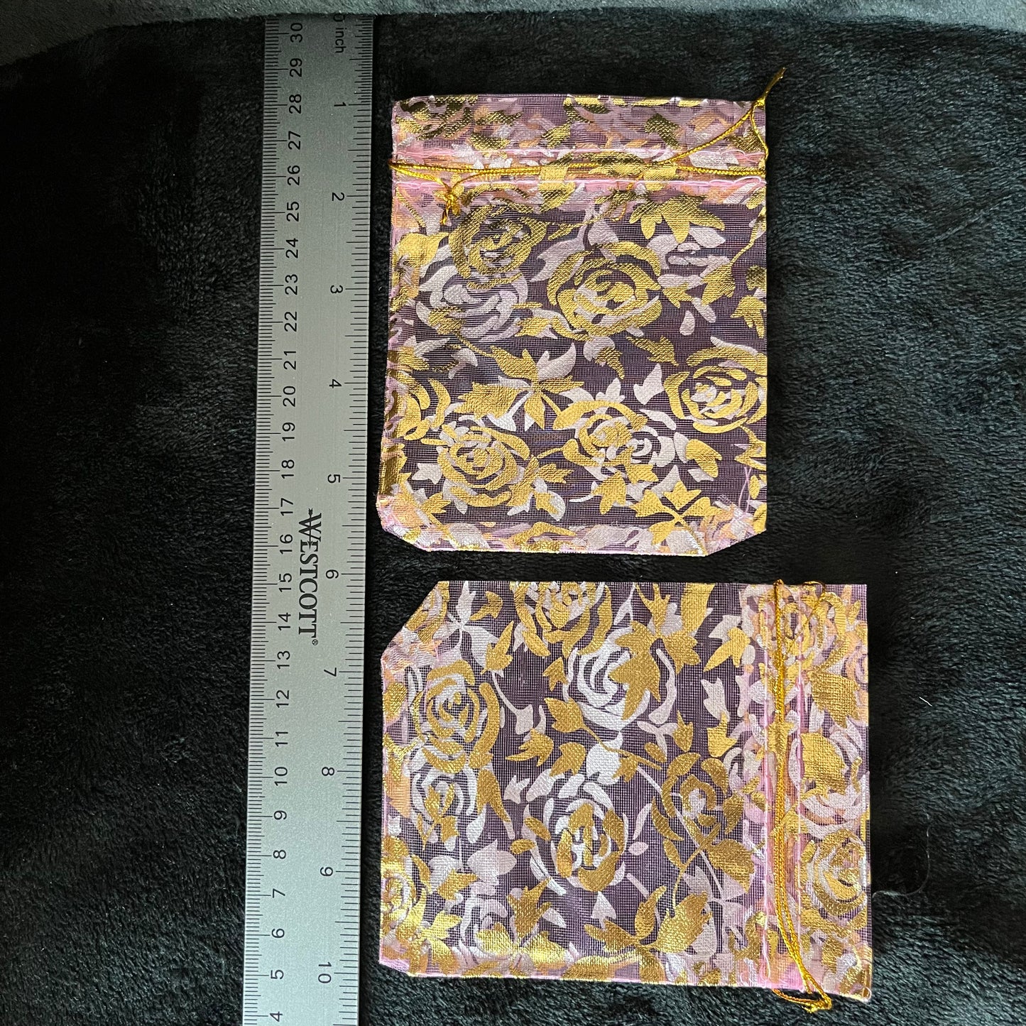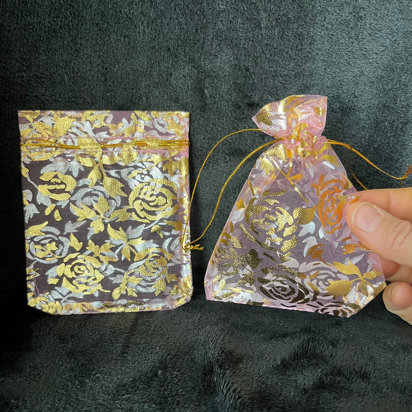 Pink Organza Drawstring Bag with Gold Tone Rose Pattern (Approx. 4 3/4” X 4”) BAG-0113