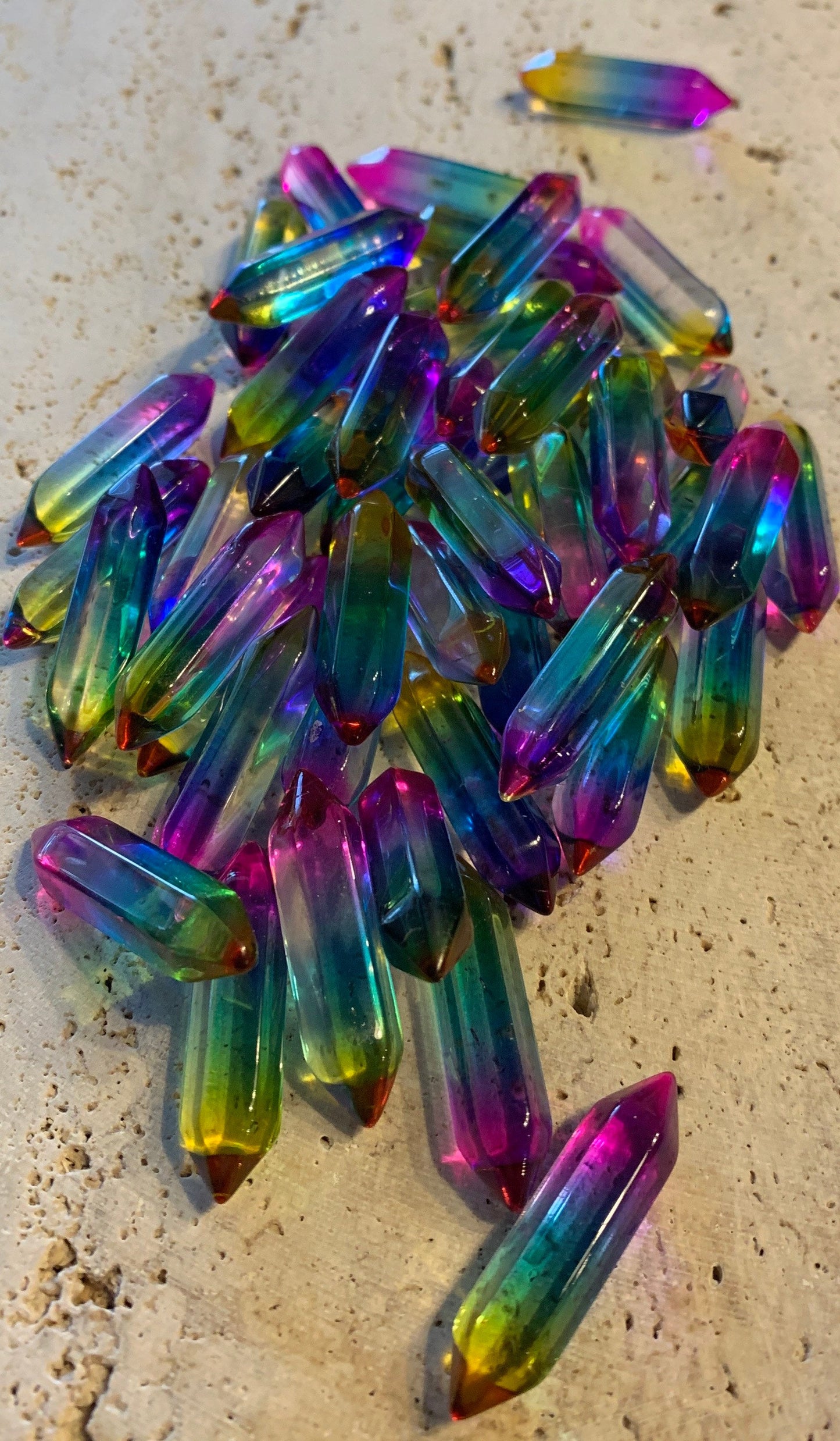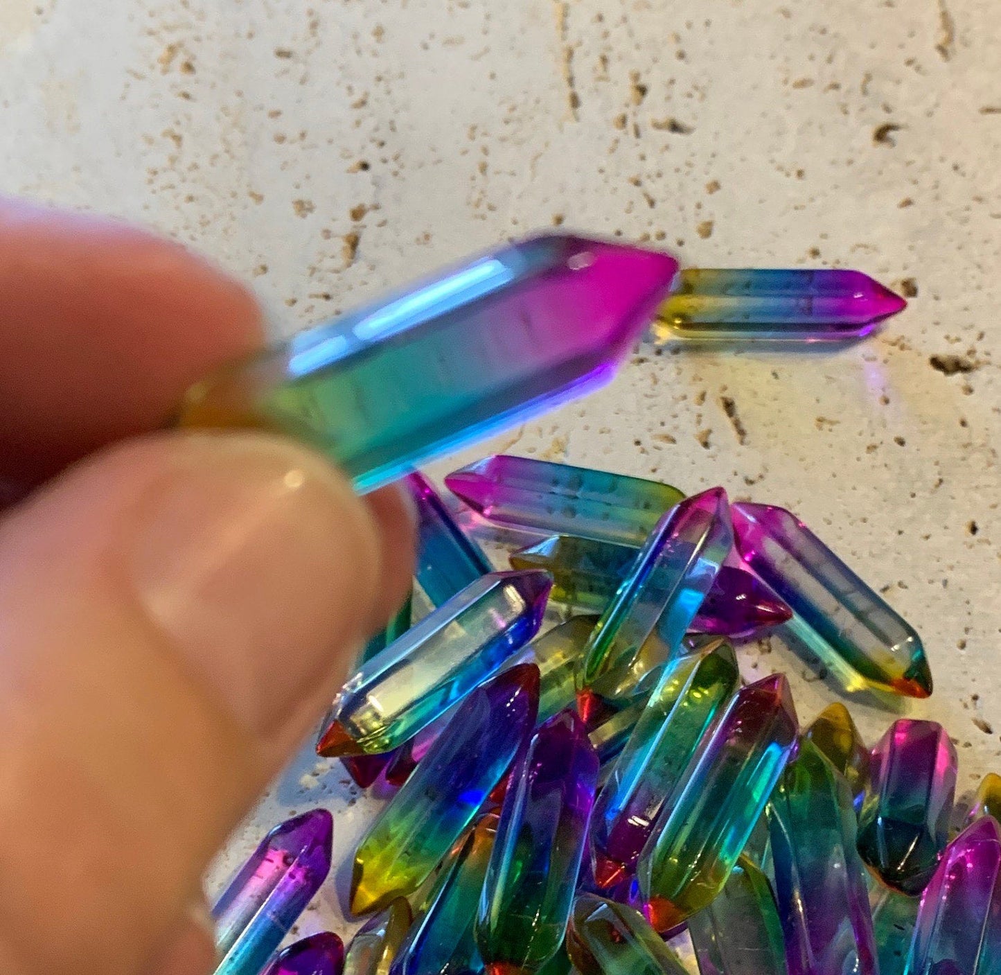 Rainbow Aura Quartz Double Terminated Crystal Point T-0011 Approx. 1 1/4” Rainbow Aura is wonderful for meditation, gridding, and healing work. Carrying or wearing Rainbow Aura will help when encountering negative or stressful situations, removing that energy and replacing it with loving, positive vibrations. Use Rainbow Aura to enhance the healing properties of other crystals You will receive the actual stone in the photos. stonepathtrading.com