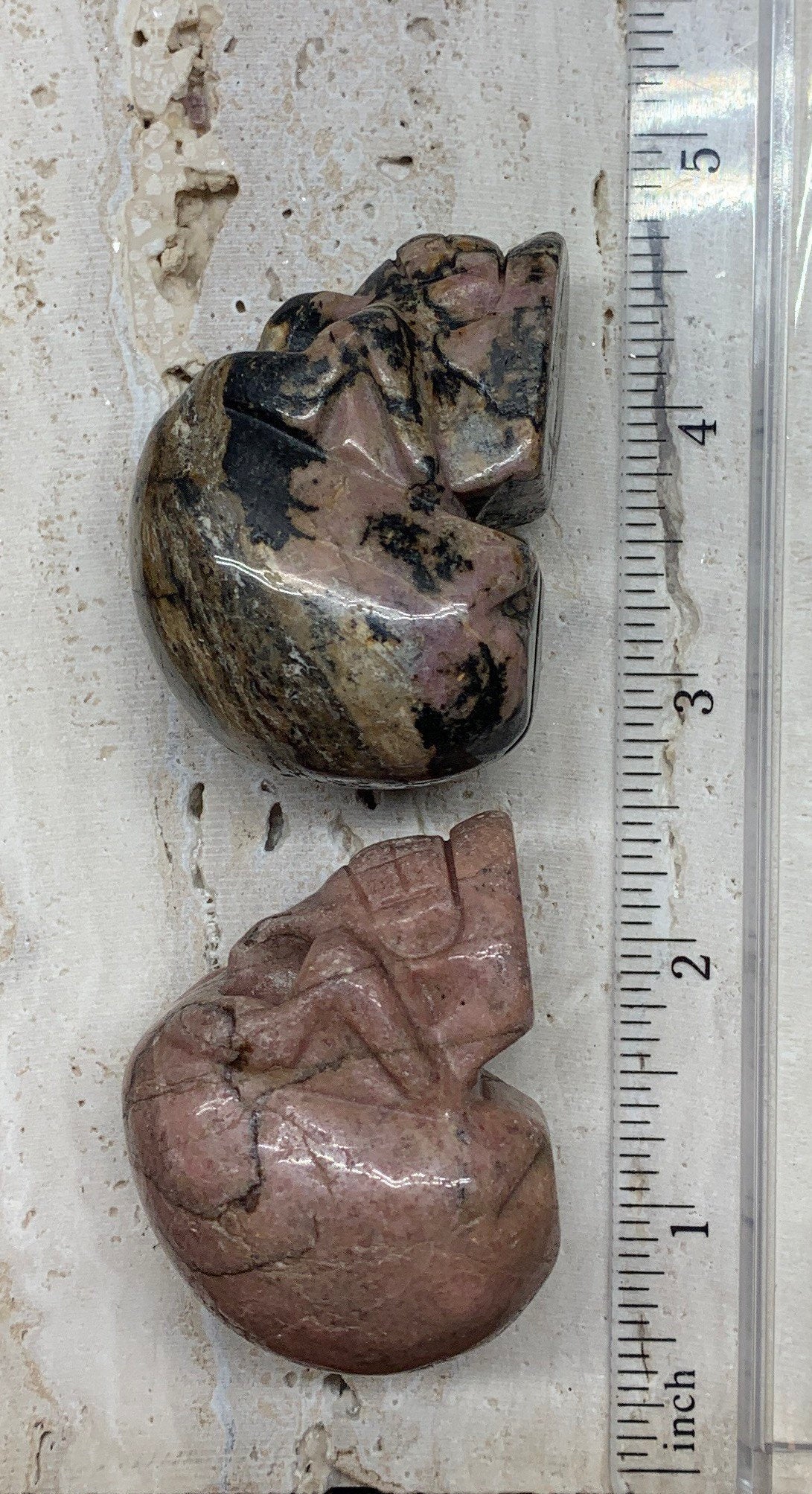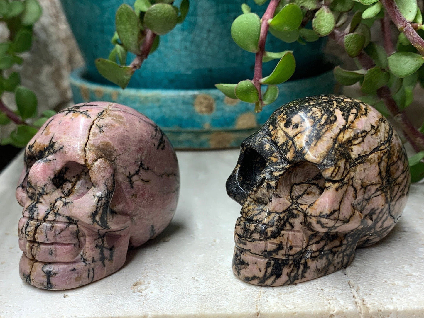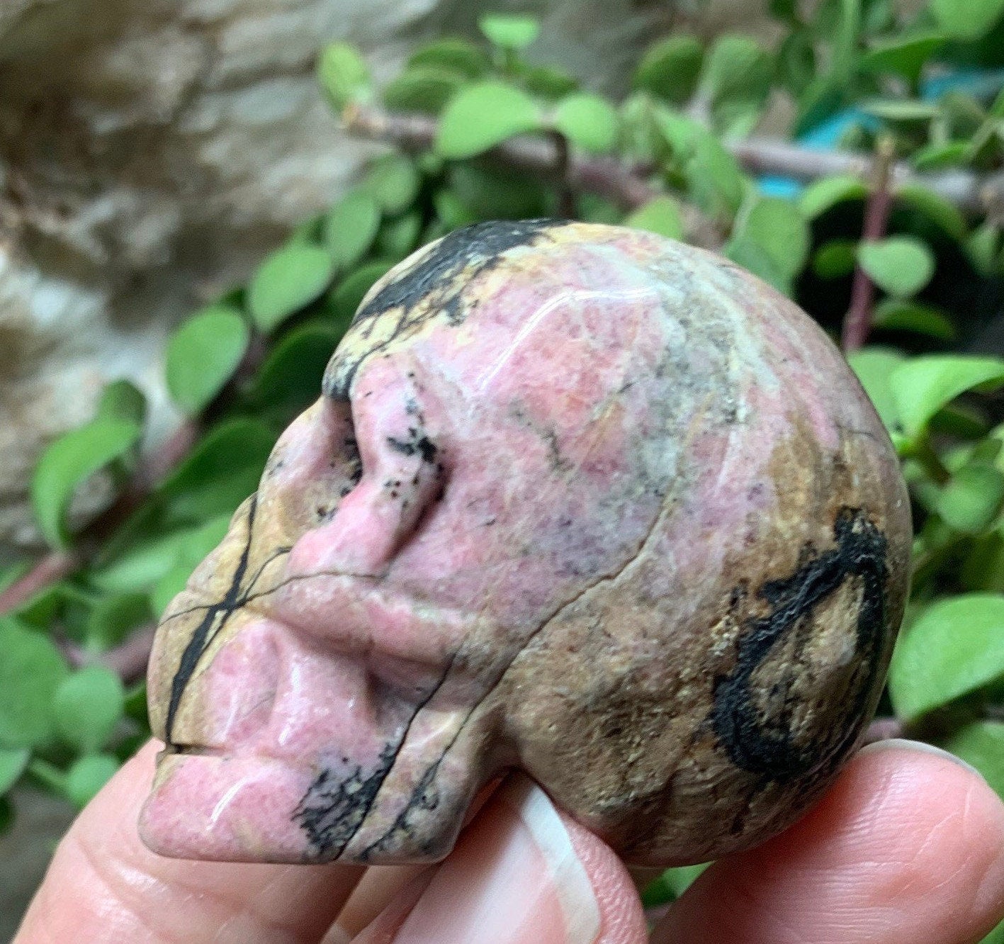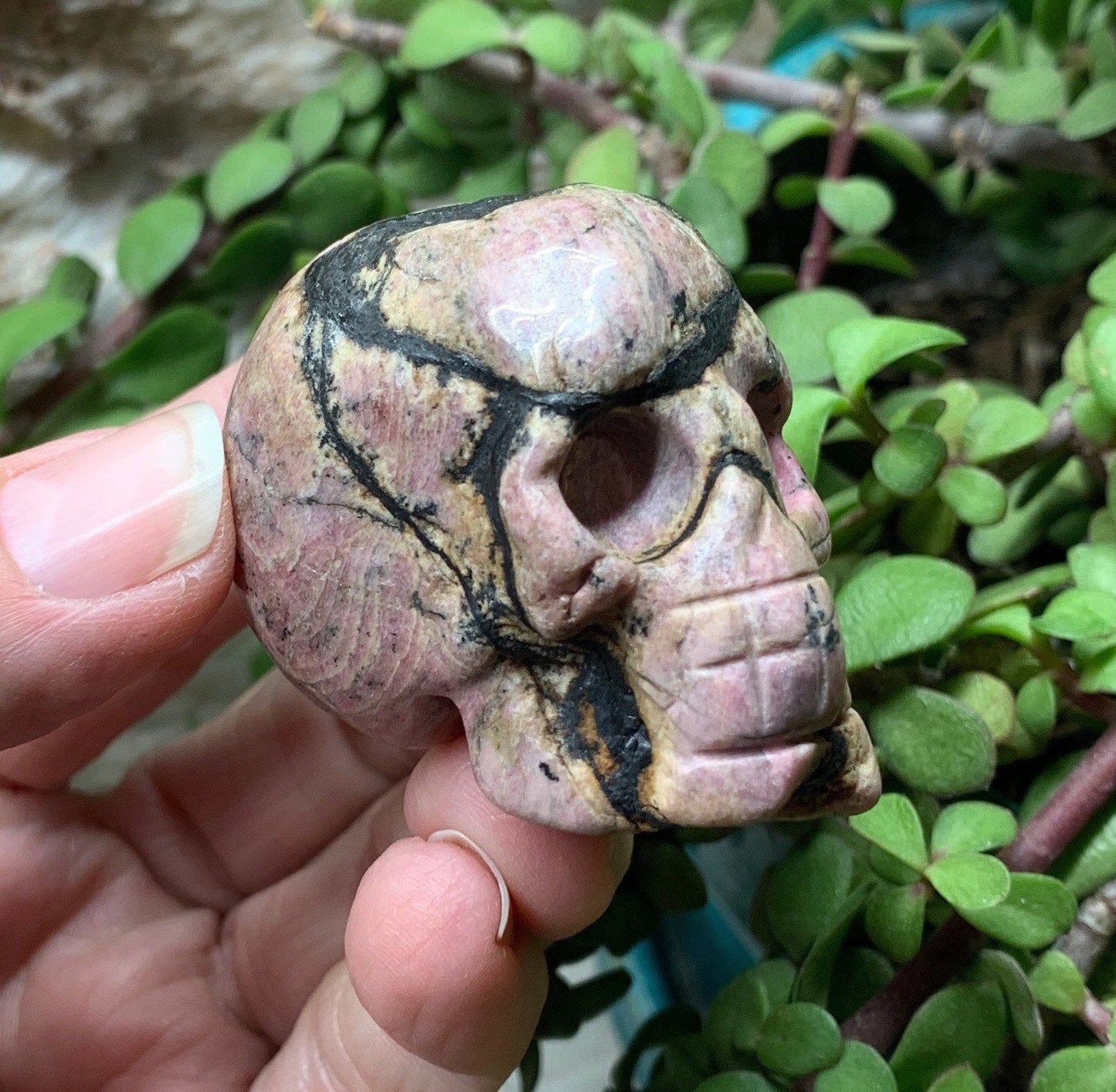 Rhodonite Carved Skull (Approx. 2") 0434 You will receive one beautiful and unique rhodonite skull similar to those pictured in listing. Rhodonite is a stone of compassion, an emotional balancer that clears away emotional wounds and scars from the past, and that nurtures love. It stimulates, clears, and activates the heart. Rhodonite grounds energy, balances yin-yang, and aids in achieving one's highest potential. It heals emotional shock and panic. See more at stonepathtrading.com