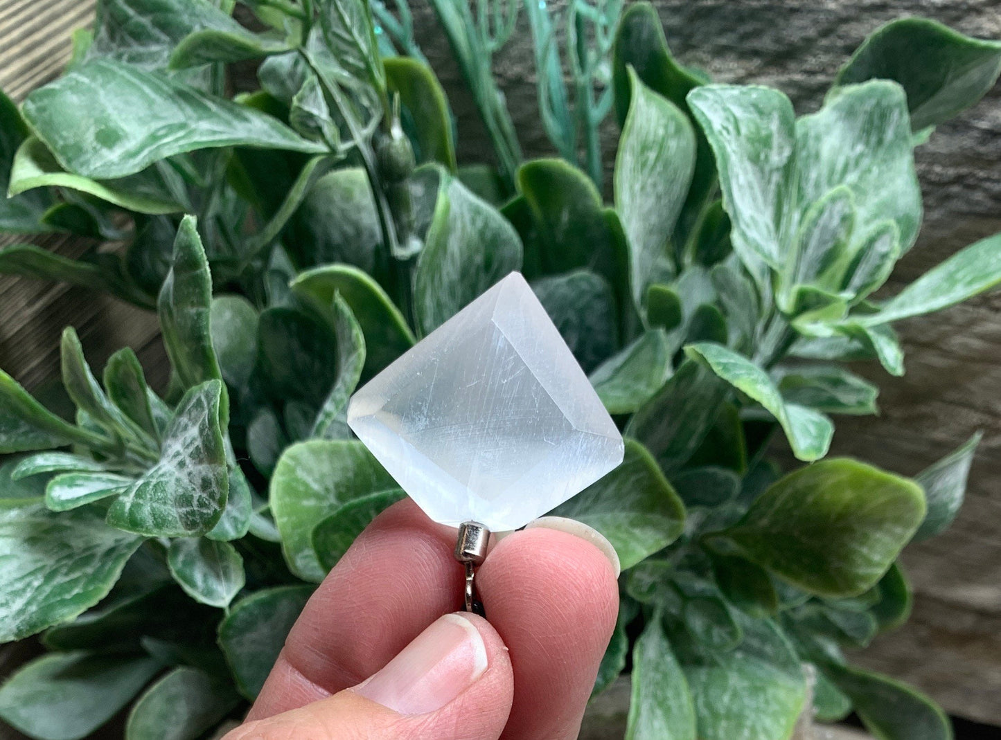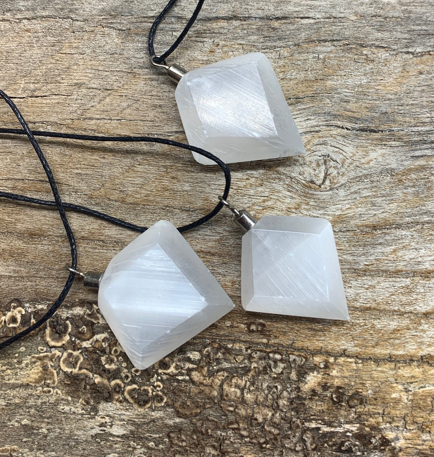 Selenite Gemstone Pendant Necklace 1083 Selenite is a calming Stone that instills deep peace. Excellent for meditation and Spiritual work. See more at stonepathtrading.com